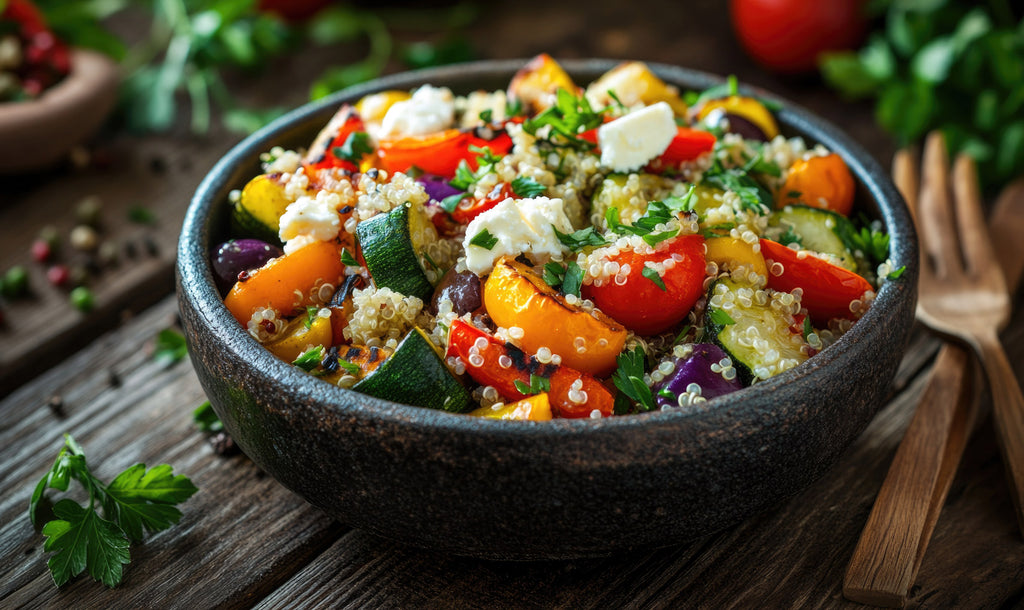 - eine bunte Quinoa-Bowl mit Gemüse und Feta