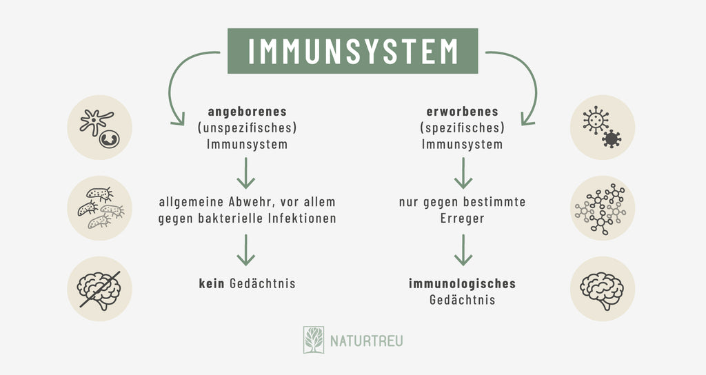 Das angeborene Immunsystem ist die erste Verteidigungslinie. Es reagiert sehr schnell und bekämpft Eindringlinge allgemein, ohne sie genau zu unterscheiden. Haut, Schleimhäute, Enzyme und andere Mechanismen verhindern, dass Krankheitserreger in den Körper gelangen. Dringen sie trotzdem ein, greifen Abwehrzellen wie Fresszellen und natürliche Killerzellen ein, die Erreger zerstören. Entzündungen oder Fieber zeigen, dass das System aktiv ist und noch mehr Abwehrzellen mobilisiert werden⁴'⁵.
