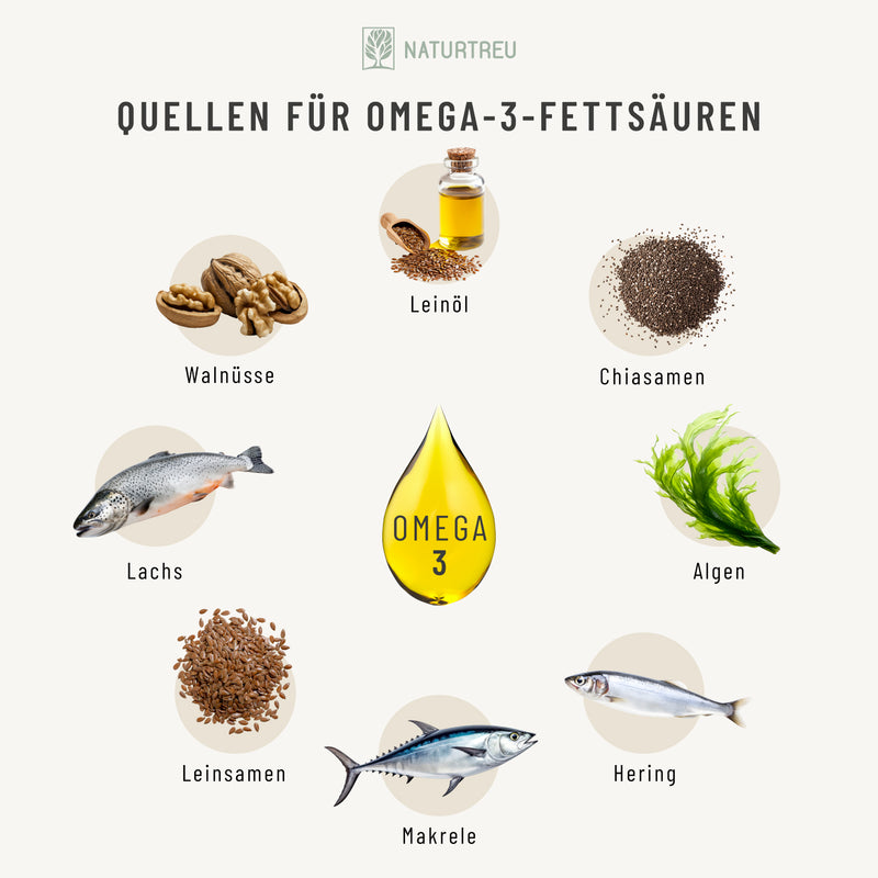 Typische Lebensmittel sind fettreiche Fischarten, wie Lachs, Makrele und Sardinen, aber auch in einigen pflanzlichen Lebensmitteln, vor allem Samen und Nüssen, ist Omega-3 zu finden⁴.