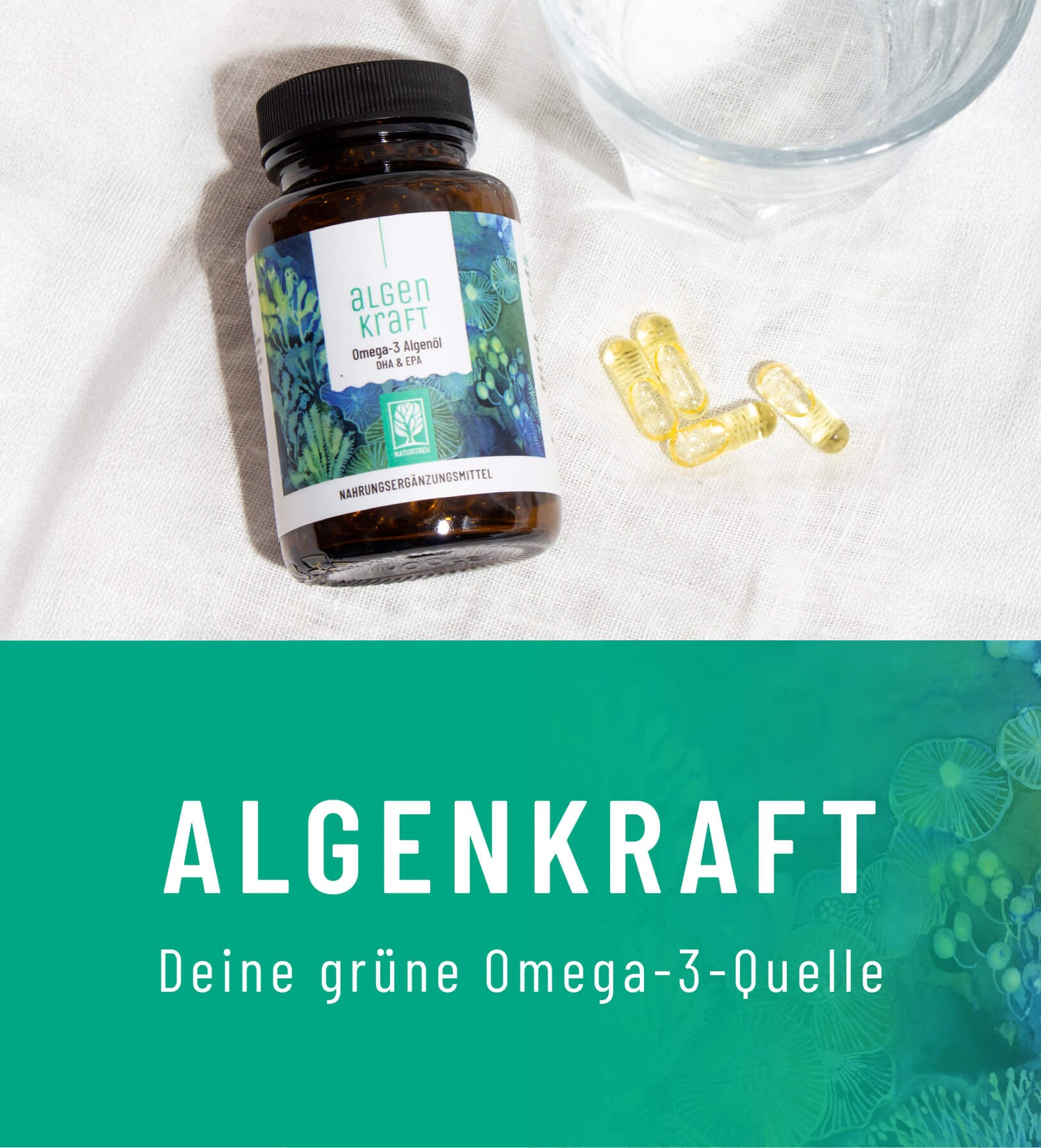 Unser ALGENKRAFT liefert hochwertige Omega-3-Fettsäuren mit 150 mg EPA und 300 mg DHA aus wertvollem Algenöl. Dies ist im Vergleich zu Fischöl eine deutlich umweltfreundlichere und nachhaltigere Wahl. ​​