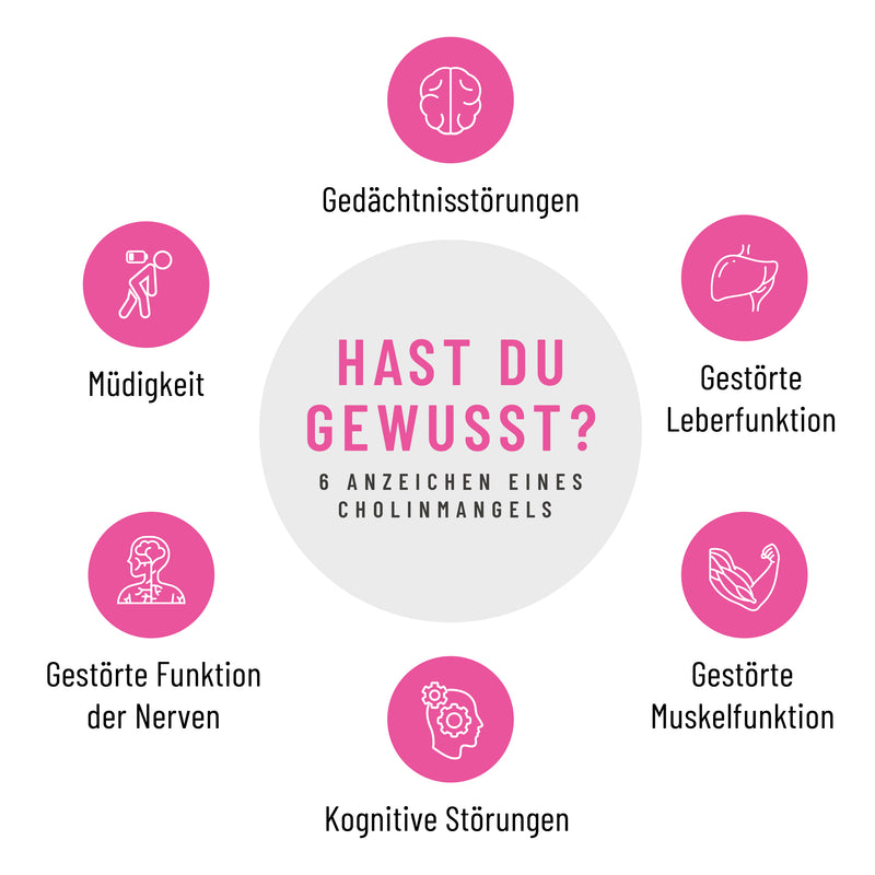 ⁷ Cholin - mangelsymptome | DocMedicus vitalstofflexikon. (n.d.). https://www.vitalstoff-lexikon.de/Weitere-Vitalstoffe/Cholin/Mangelsymptome#:~:text=Symptome%20eines%20Cholinmangels&text=Ein%20Mangel%20kann%20zu%20kognitiven,den%20Fettstoffwechsel%20in%20der%20Leber