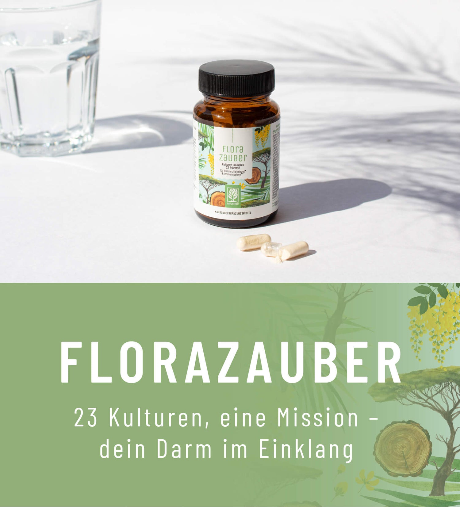 Bestimmt hast du schon gehört, dass der Darm auch gerne als „das zweite Gehirn“ bezeichnet wird. Und diese Bezeichnung hat er sich verdient.  Denn der riesige Muskelschlauch ist weit mehr als nur ein notwendiges Verdauungsorgan.  Er ist das Zuhause von unterschiedlichen Mikroorganismen – zum Beispiel von Bakterien, Pilzen und Viren – die in Zusammenarbeit unzählige Prozesse in deinem Körper übernehmen. Unser FLORAZAUBER kann deinen Darm¹ unterstützen. Seine ganzheitliche Zusammensetzung enthält neben 23 nützlichen Bakterienstämmen auch wichtige Vitamine, die für dein Wohlbefinden von höchster Bedeutung sein können.