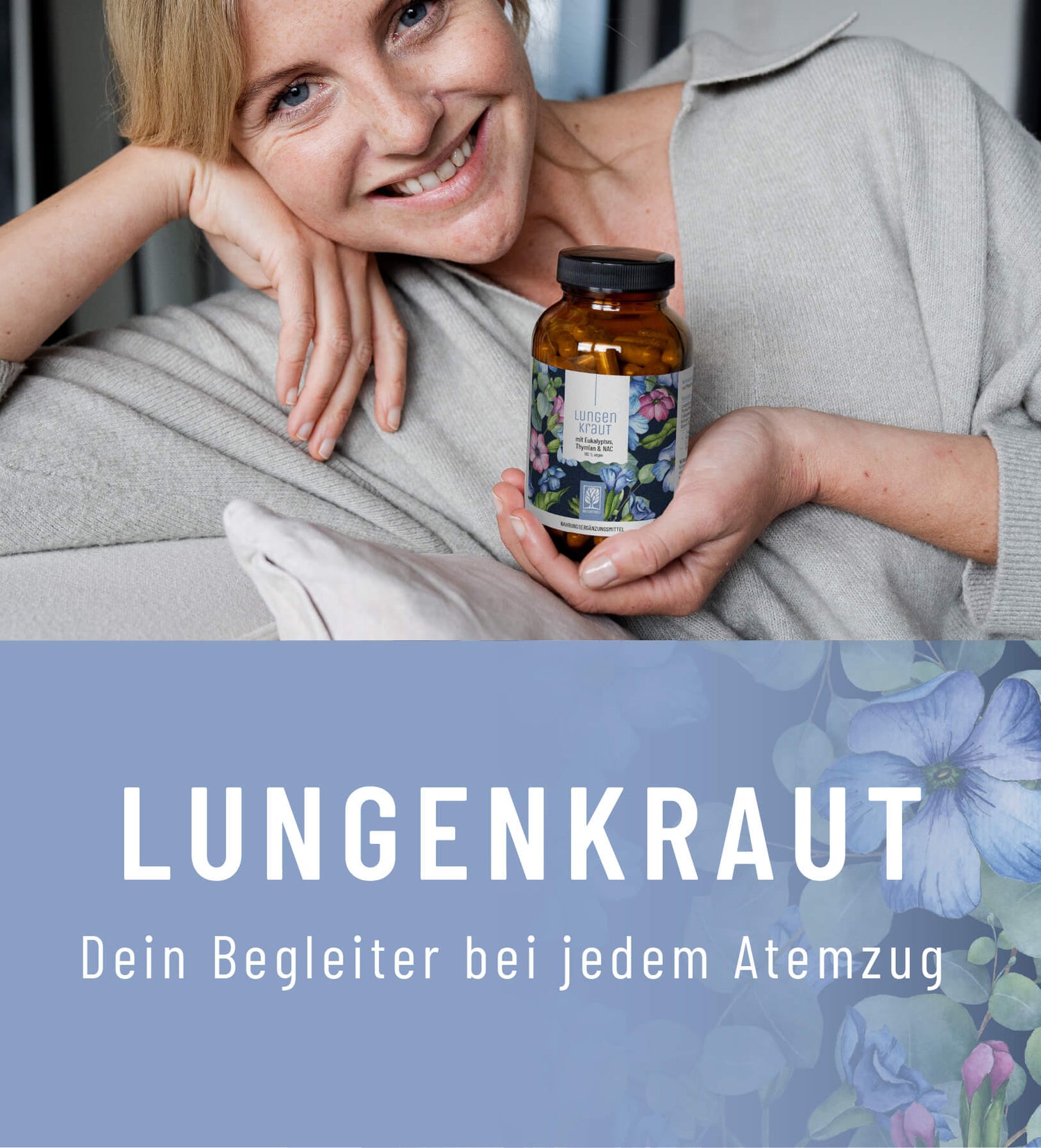 LUNGENKRAUT kombiniert hochwertige Pflanzenstoffe, die in der Natur seit Jahrhunderten geschätzt werden. An erster Stelle steht das namensgebende Premium-Lungenkraut (Pulmonaria officinalis), das direkt aus Indien stammt. Ergänzt wird die Rezeptur durch Thymian- und Eukalyptusextrakt (jeweils 200 mg je 2 Kapseln). Für gewöhnlich sind diese drei wertvollen Pflanzenstoffe nur einzeln erhältlich, doch in unserem LUNGENKRAUT werden sie in einer durchdachten Formulierung vereint.