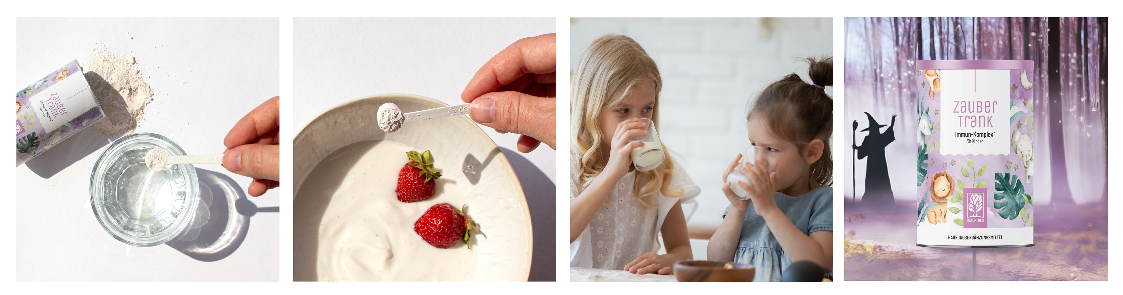 Mit ZAUBERTRANK haben wir einen liebevoll zusammengestellten Immun-Komplex in Pulverform entwickelt. Mit allen wichtigen Mikronährstoffen, die dein Kind bei seiner natürlichen Entwicklung unterstützen – vom Immunsystem über Knochen und Zähne bis hin zu Konzentration und Lernen.
