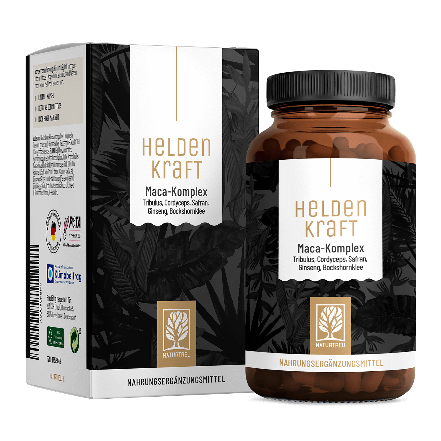Besonders im Vergleich zu anderen Produkten ist auch die Dosierung des Inhaltsstoffs Maca: Das Maca in HELDENKRAFT ist ein 20:1-Extrakt – das bedeutet, dass die enthaltene Menge (50 mg pro Tagesportion) der 20-fachen Maca-Knollenpulvermasse, also 1.000 mg, entspricht.