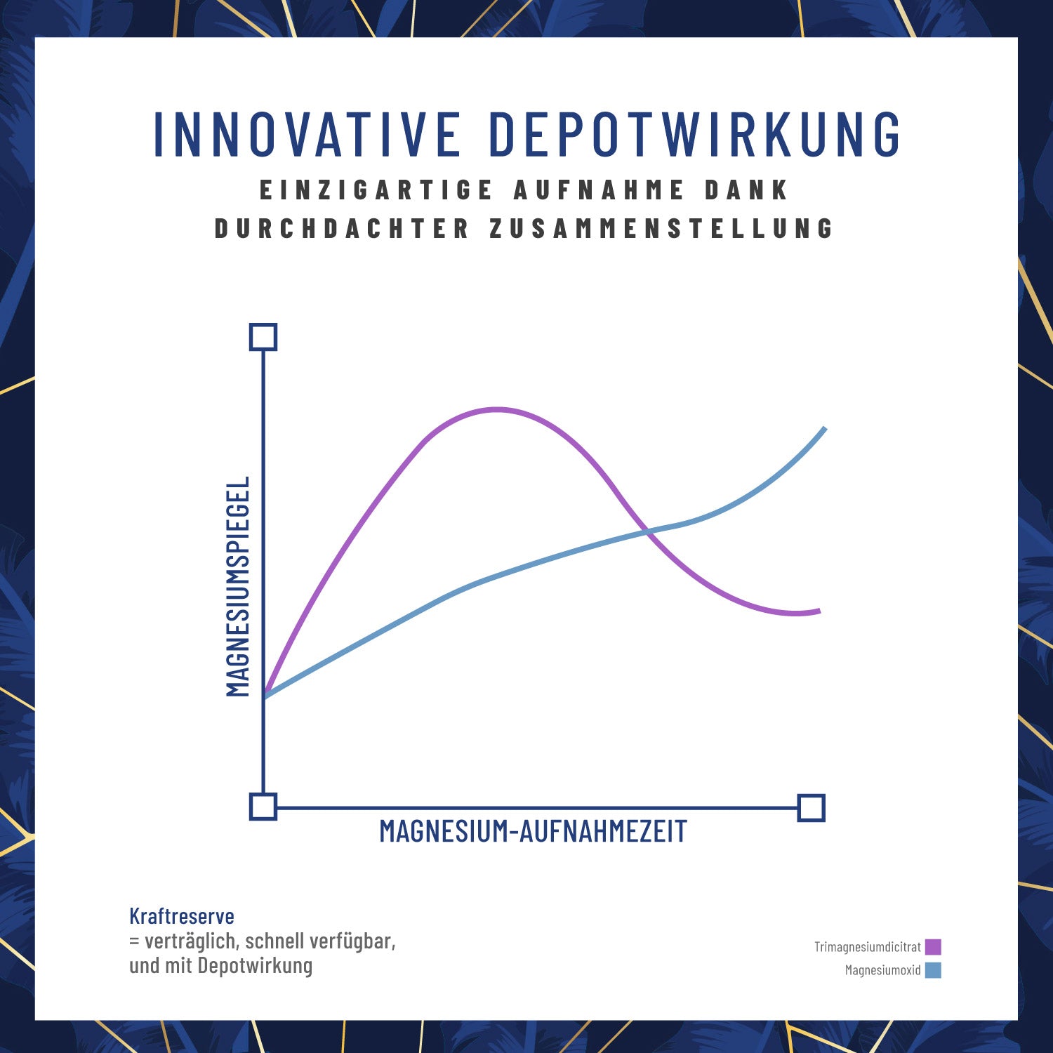 - Das enthaltene Magnesiumoxid wird hingegen langsamer aufgenommen, dafür aber länger im Körper gespeichert, wodurch eine Depotbildung entsteht.