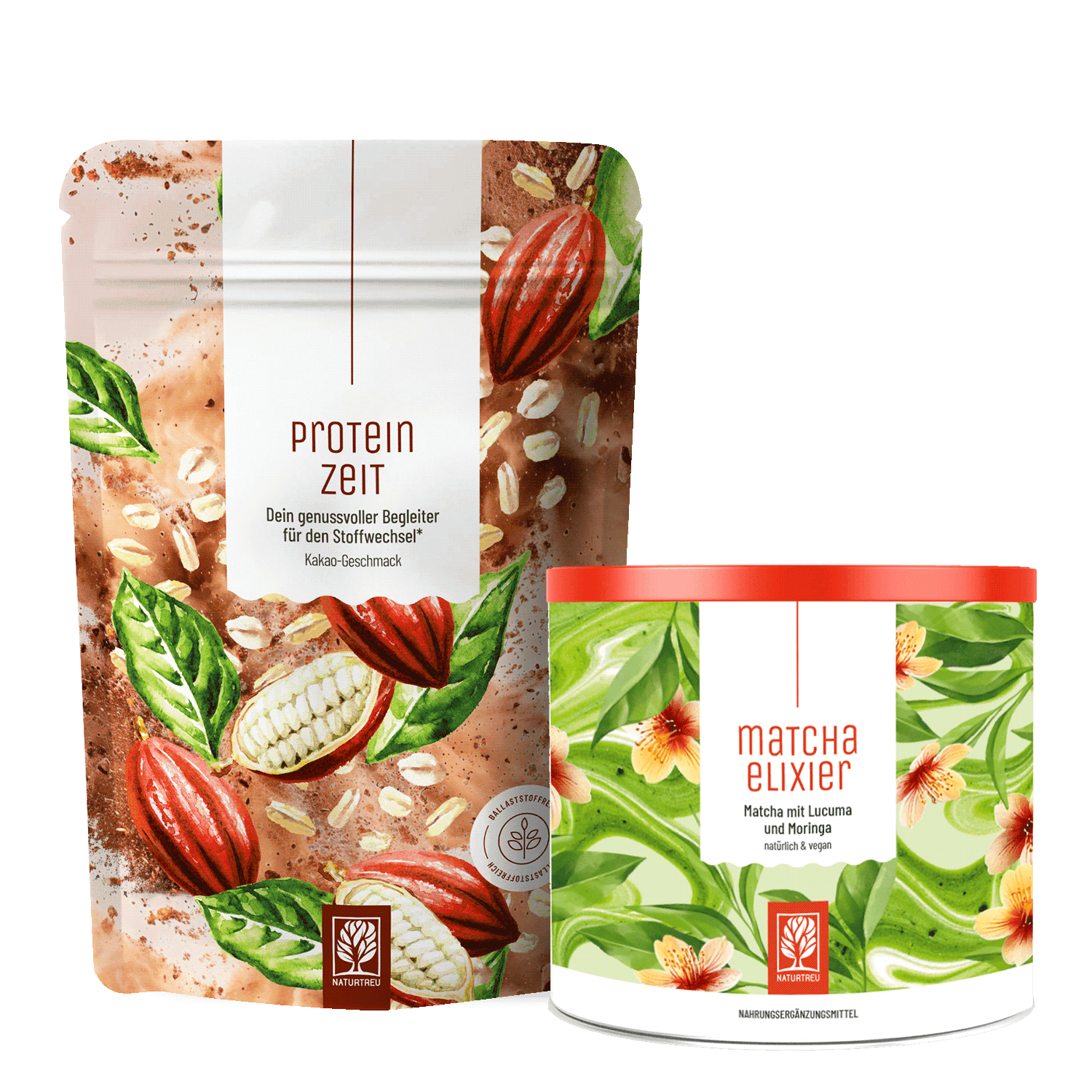 Mit unserem GENUSSZEIT Paket hast du zwei beliebte Produkte vereint:  Unser mildes Matcha-Latte-Pulver für besondere Genussmomente und PROTEINZEIT als praktische Protein- und Ballaststoffquelle für eine schnelle und ausgewogene Ergänzung – die perfekte Unterstützung von morgens bis abends.