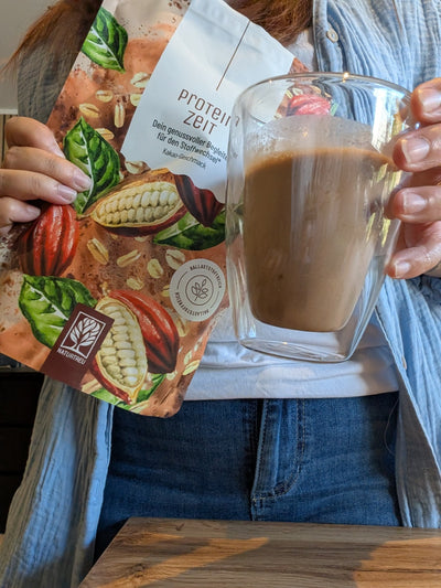 Einfach das Pulver mit Pflanzendrink anrühren und in Sekunden den cremigen Schokoladengeschmack genießen. Und das Beste: PROTEINZEIT ist glutenfrei, ohne Soja und ohne zugesetzten Zucker.