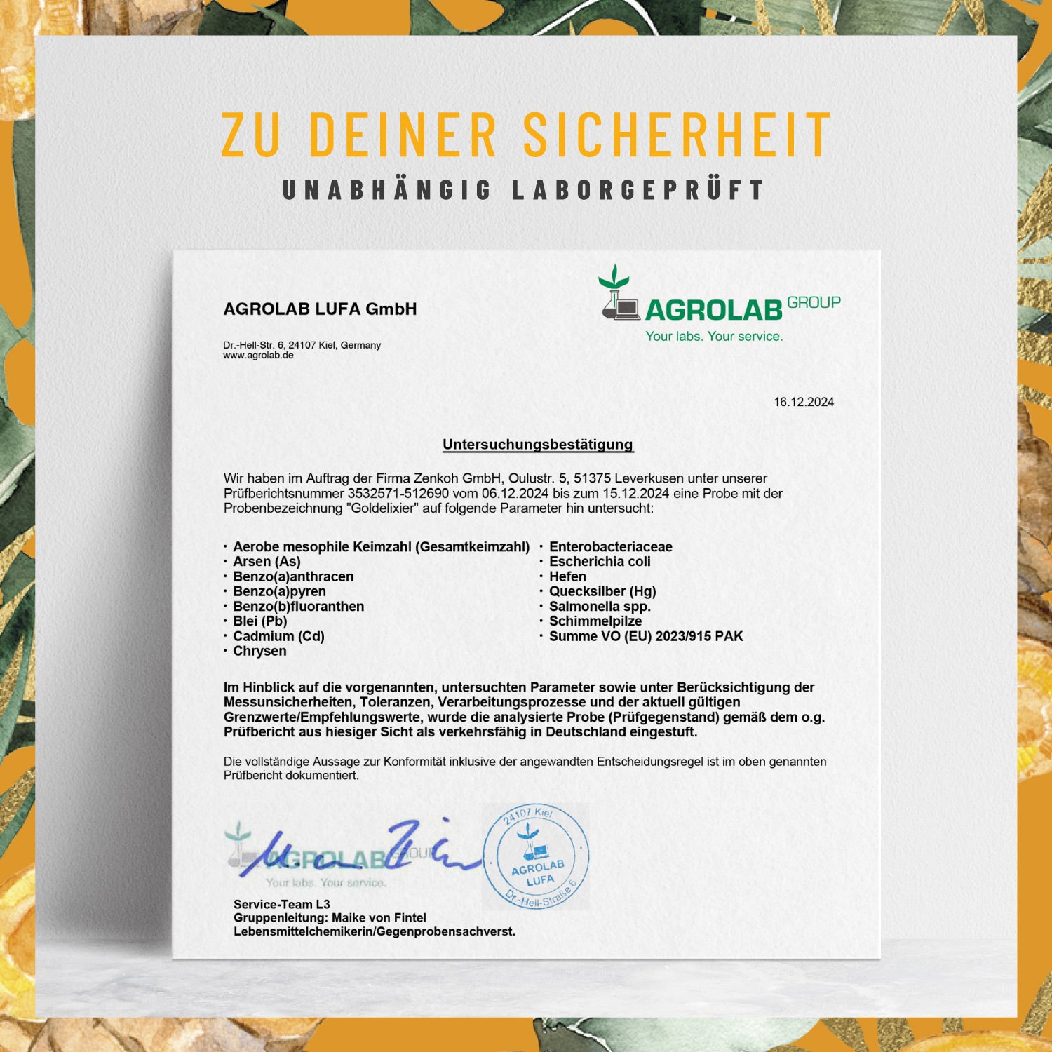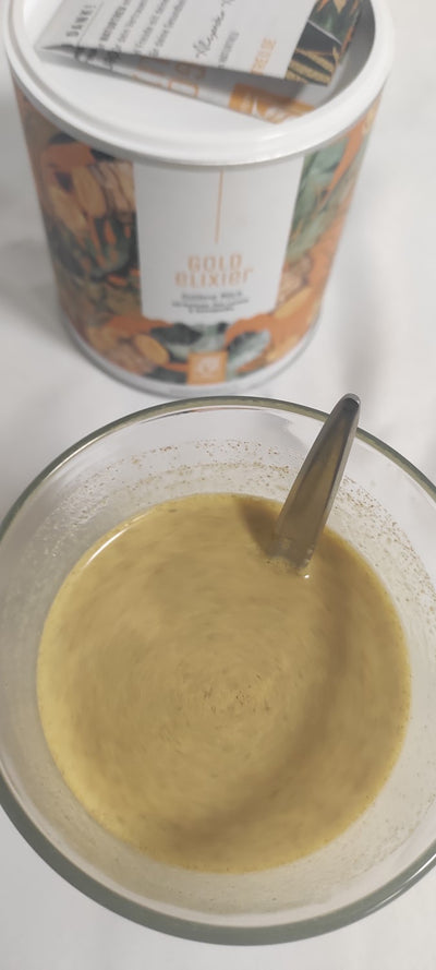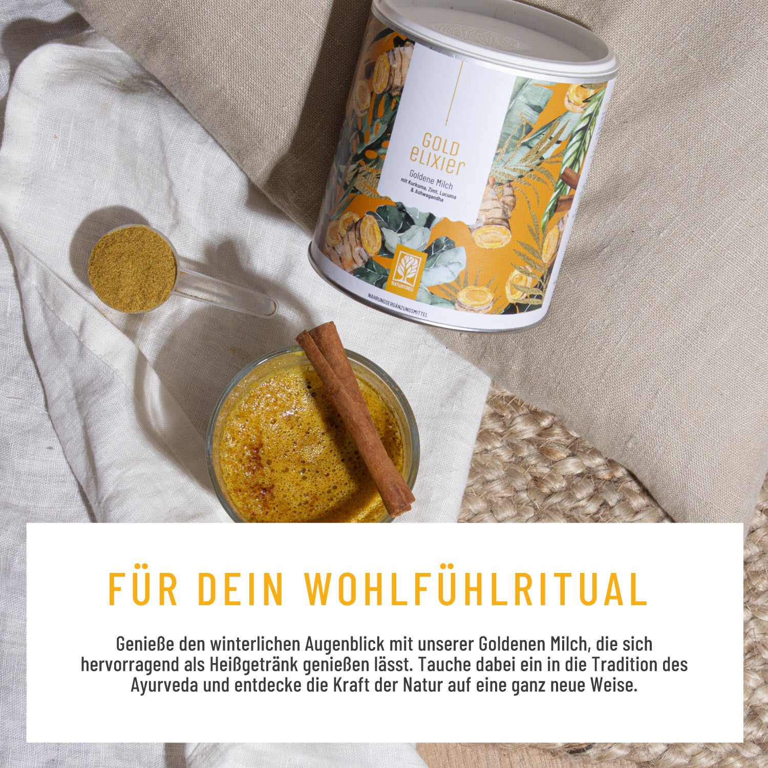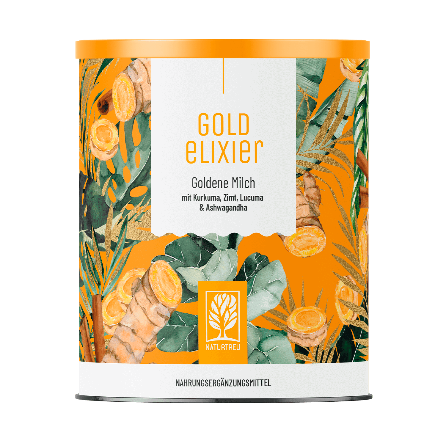 Für Goldene Milch gibt es unzählige Rezepturvarianten. Unser GOLDELIXIER ist eine Komposition aus den bekanntesten südostasiatischen Pflanzenstoffen, angefangen von Ashwagandha (dem „indischen Ginseng“) über Lucuma, das auch das „Gold der Inkas“ genannt wird, und natürlich Kurkuma bis hin zu Zimt. Des Weiteren ist schwarzer Pfeffer enthalten. Dieser dient dazu, die Bioverfügbarkeit des im Kurkuma enthaltenen Curcumins zu erhöhen.