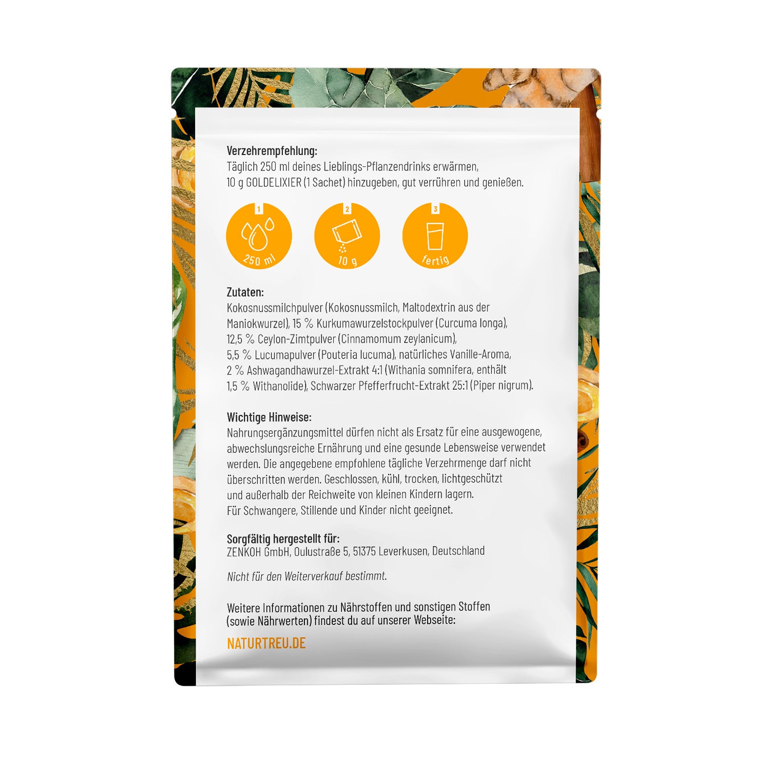 Dosierungsempfehlung Täglich 250 ml deines Lieblings-Pflanzendrinks erwärmen, 10 g GOLDELIXIER (1 Sachet) hinzugeben, gut verrühren und genießen.